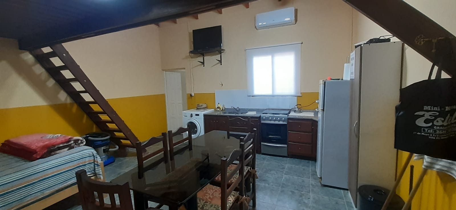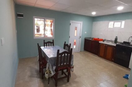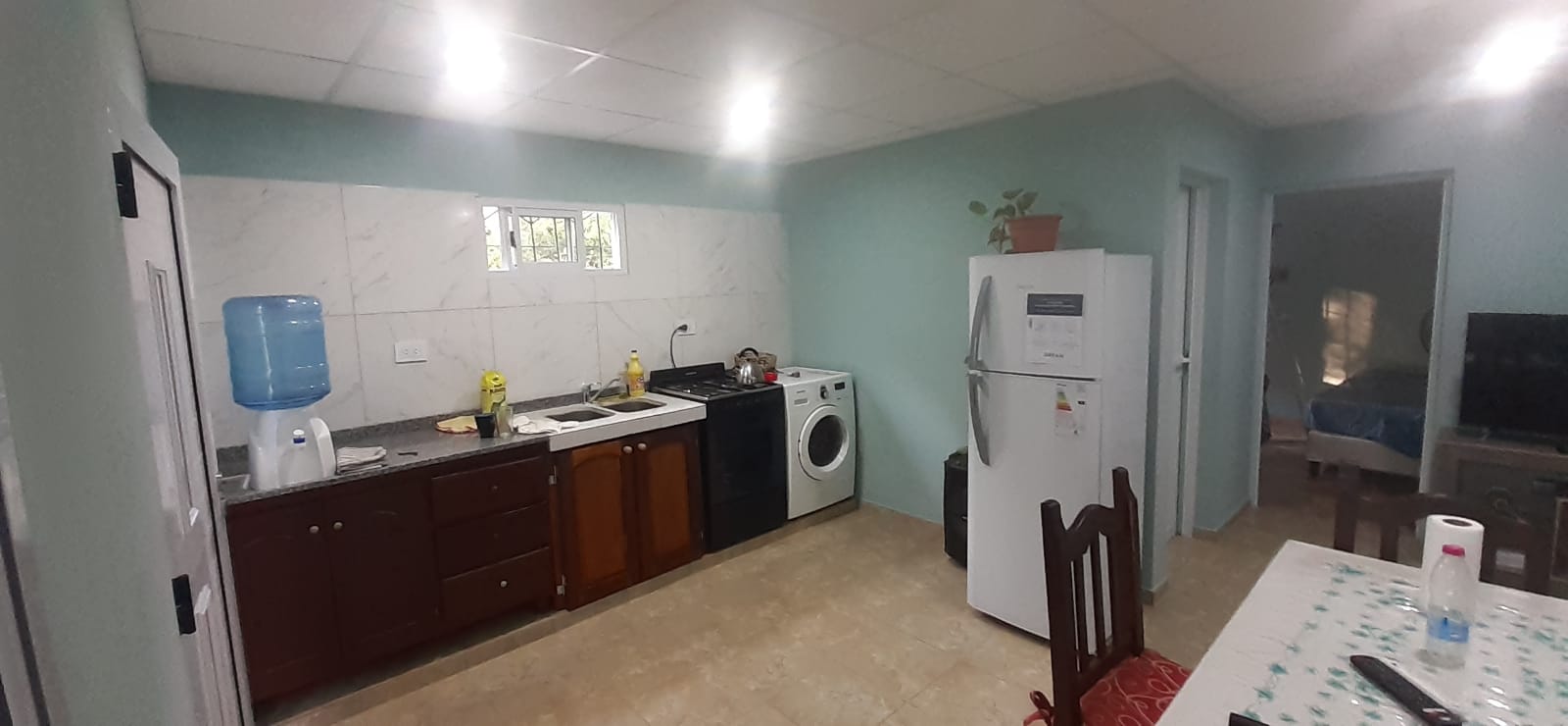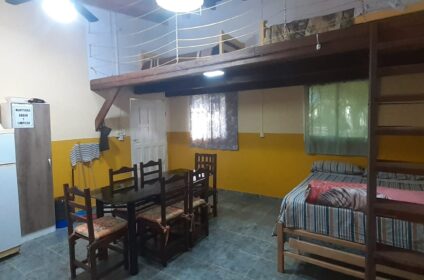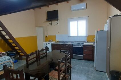 El hospedaje cuenta con heladera, lavarropas, cocina, dispenser, agua caliente