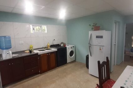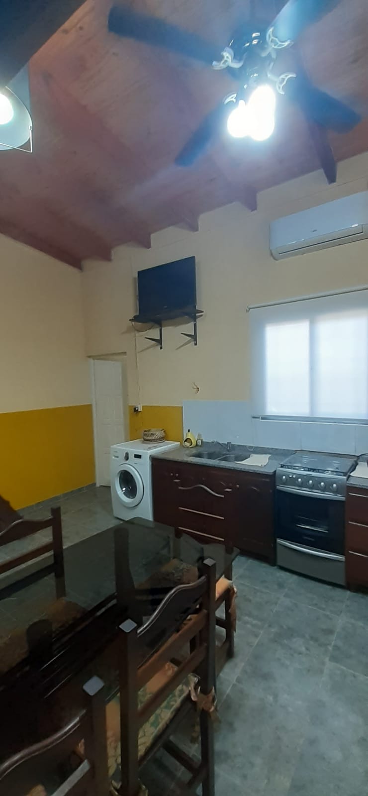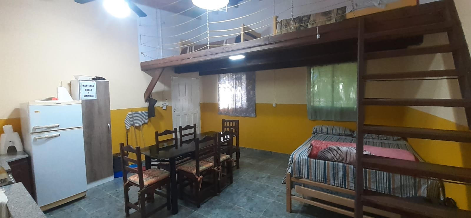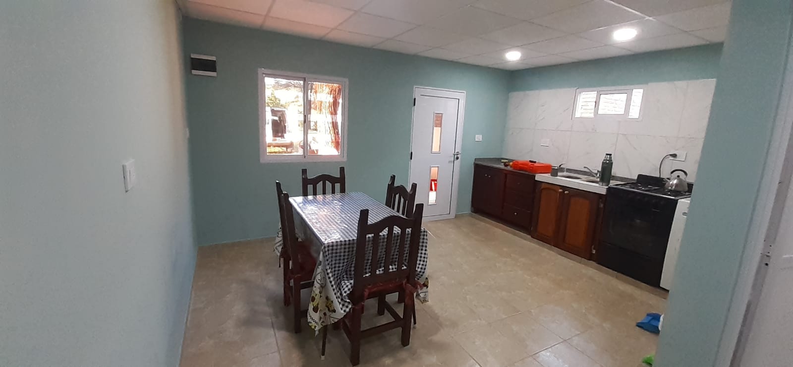 El hospedaje cuenta con heladera, lavarropas, cocina, dispenser, agua caliente
