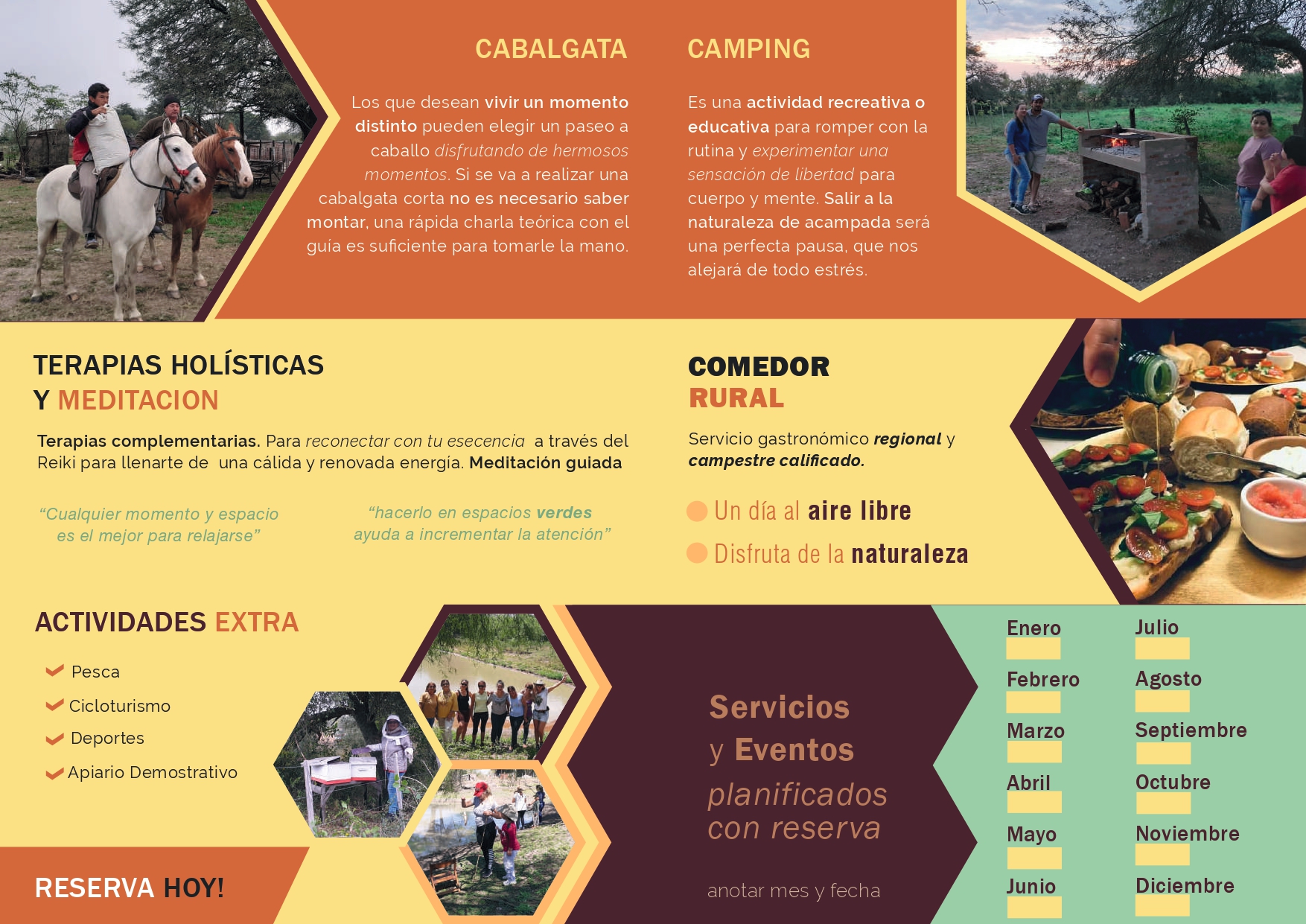 Disfrutá del Turismo Rural en el establecimiento. Podrás entrar en contacto con espacios naturales en camping, pesca y cabalgata. Participá activamente en gastronomía tradicional calificada y agroturismo.